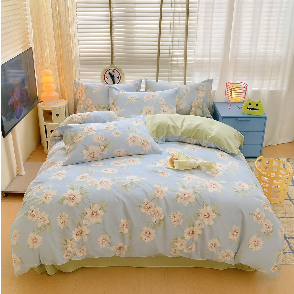 Bring a touch of elegance and comfort to your bedroom with the Blossom Dream Pure Cotton Bedding Set. Featuring a soothing pastel blue base adorned with soft floral prints in delicate pinks and greens, this set creates a refreshing and tranquil sleeping environment.