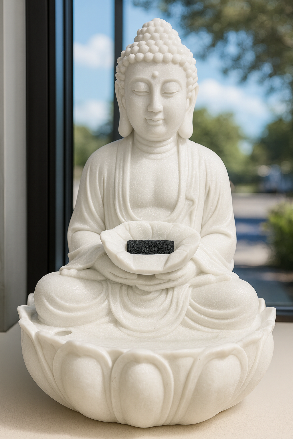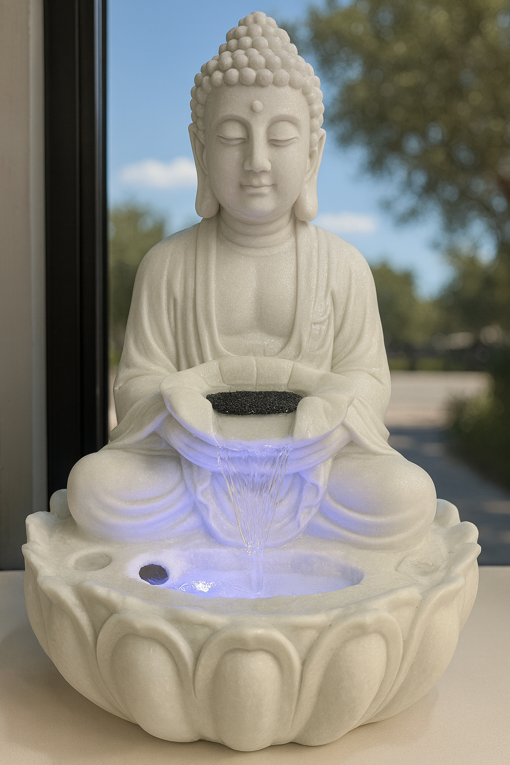 Integrated Fountain – Flowing water gently cascades from the lotus bowl held by Buddha, symbolising purity, harmony, and continuous renewal.
