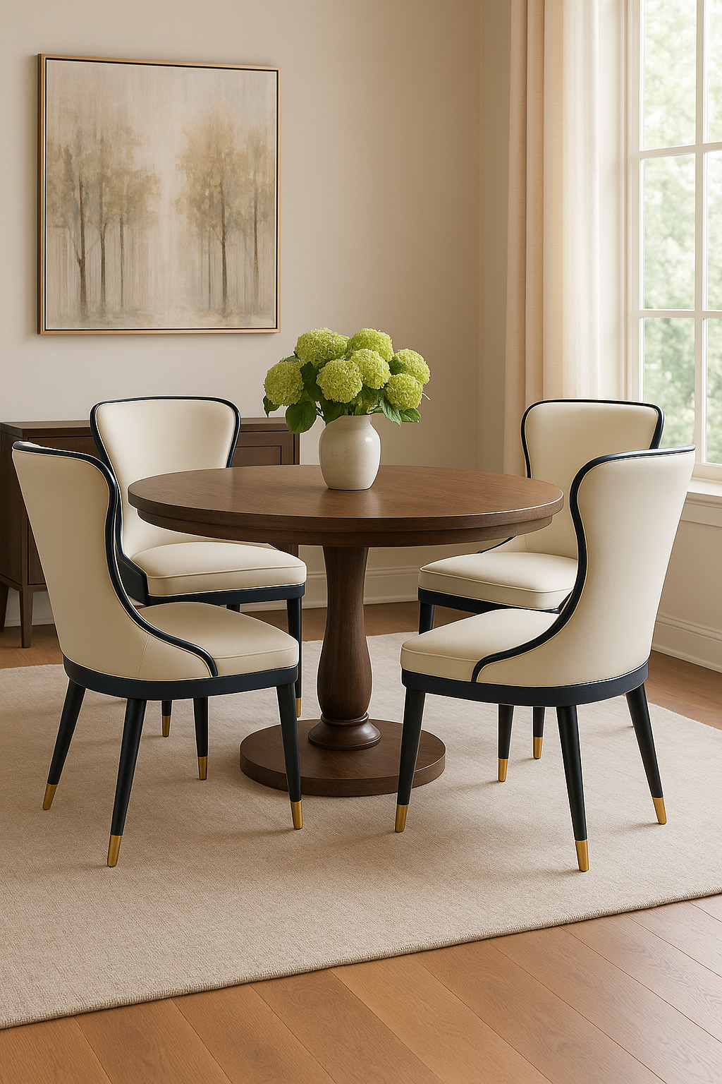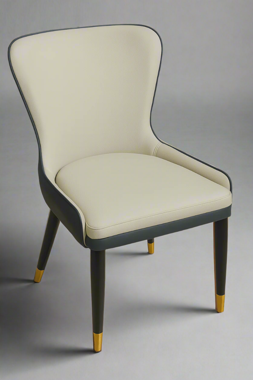 This dining chair embodies timeless elegance with a modern edge. Upholstered in smooth cream PU leather, it offers a soft and refined look, beautifully contrasted with deep navy side panels and piping for a striking two-tone effect. The wide, gently flared backrest provides both comfort and sophistication, making it a standout piece in any dining or living space.