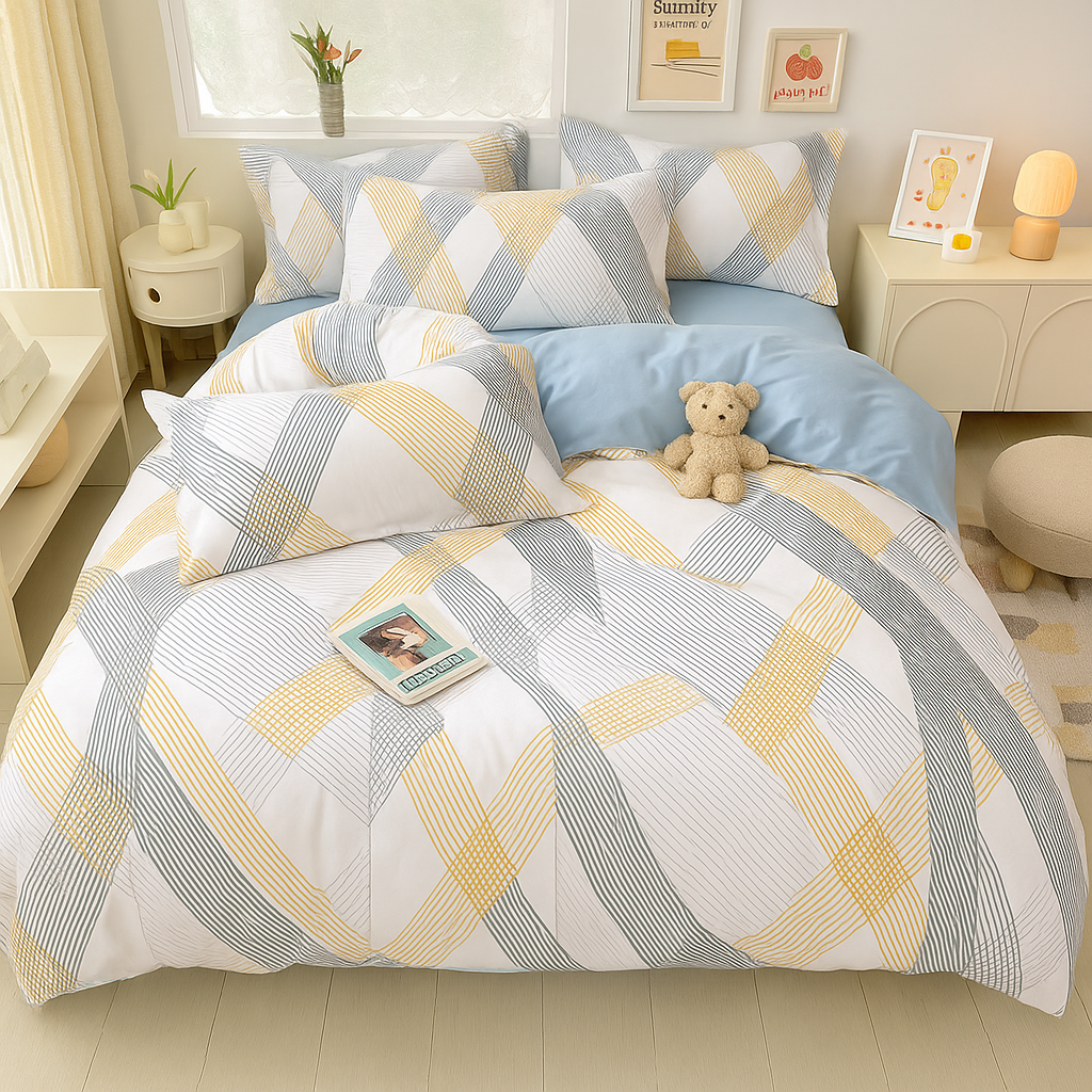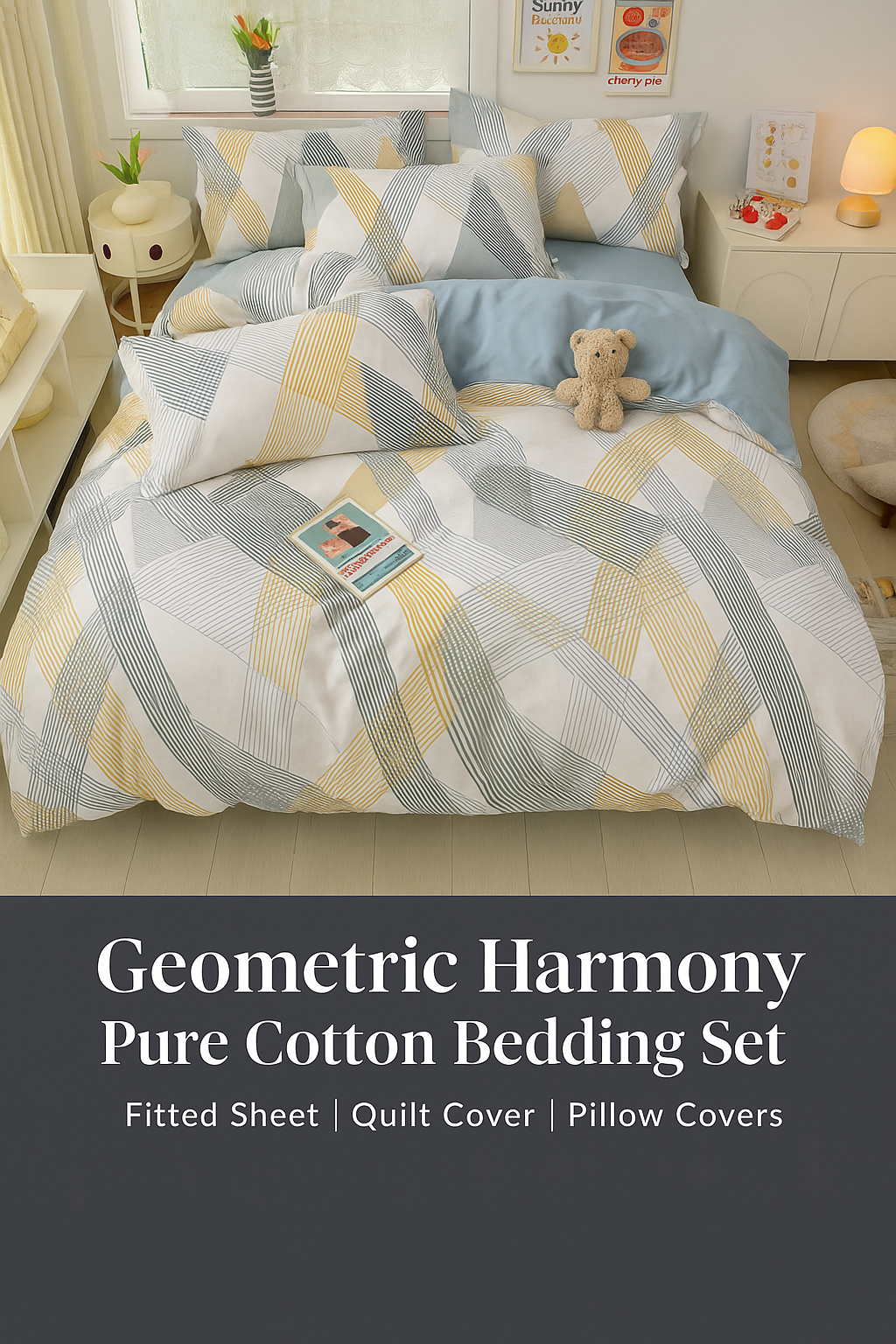 Elevate your bedroom with the modern elegance of the Geo Harmony Pure Cotton Bedding Set. Designed with a sophisticated blend of soft grey, warm yellow, and crisp white geometric patterns, this set brings both comfort and contemporary style.