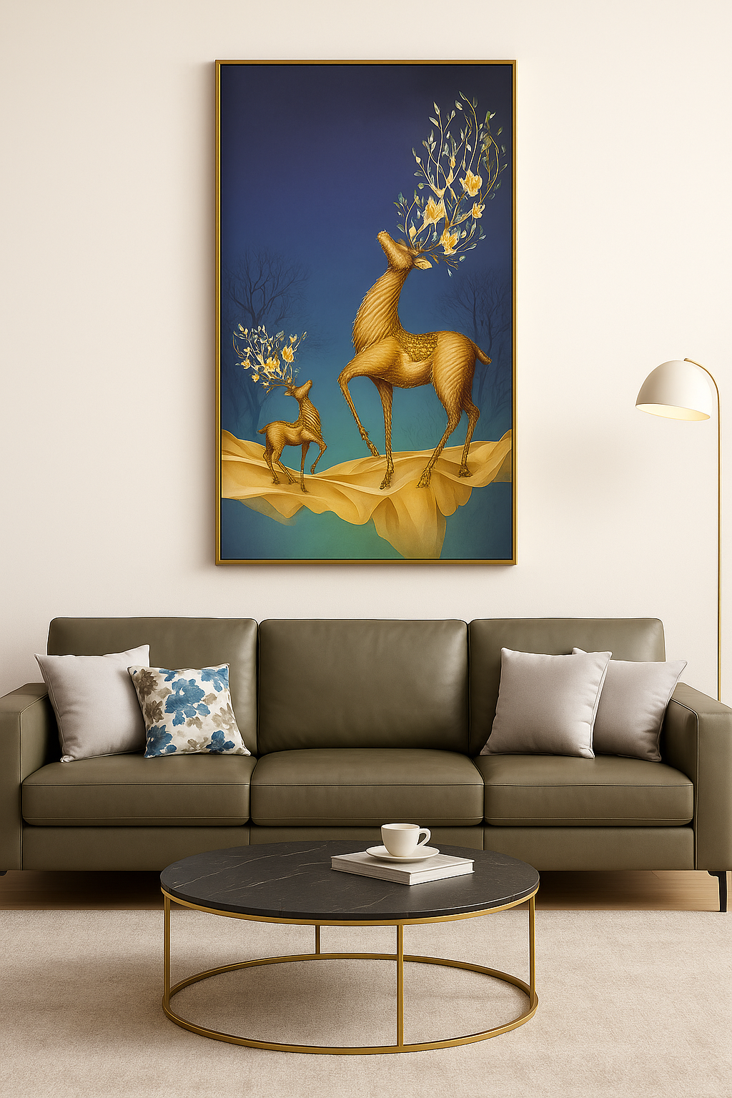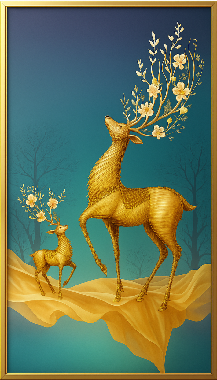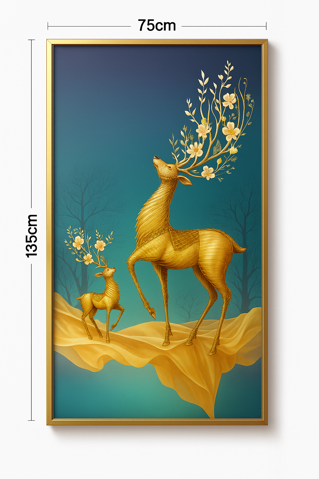 This premium artwork showcases two majestic golden deer set against a serene backdrop, symbolizing grace, strength, and harmony. Designed with a unique threaded 3D technique, the deer figures display remarkable depth and texture, with intricate antlers adorned by blooming golden flowers and leaves.