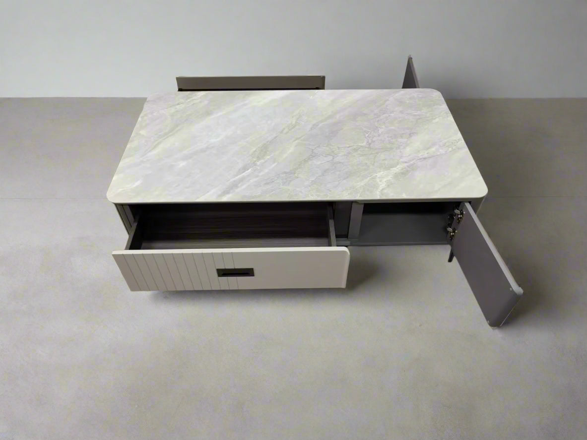 Elevate your living space with this modern coffee table, crafted with a blend of premium panel wood and sintered stone for both durability and luxury. Designed with buffer track drawers, it combines style and functionality, offering smooth and quiet storage access.