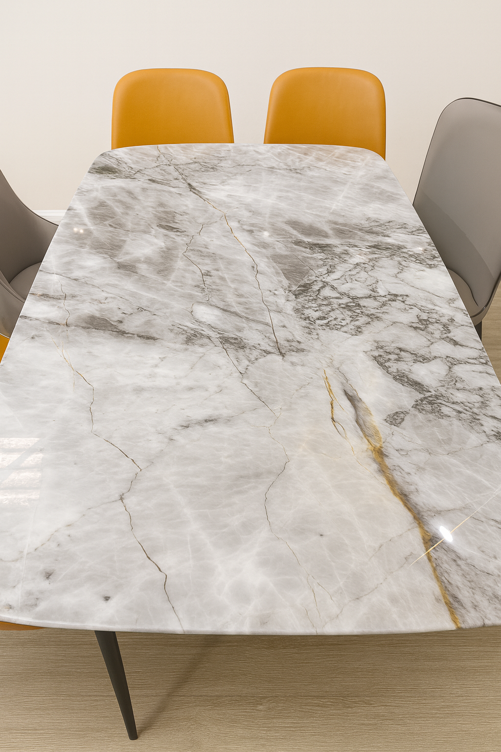 Unique Patterning – A blend of soft white and light gray tones with bold dark veining, enhanced by striking golden accents that make every table one-of-a-kind.